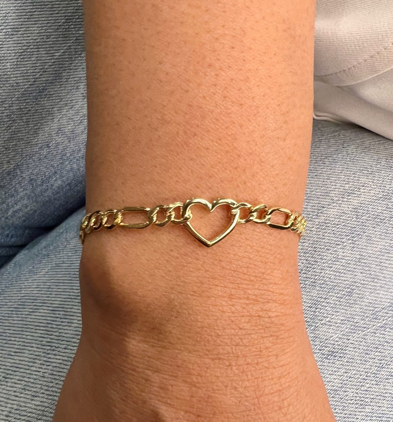 Crafted from genuine 14K yellow gold, the Heart Figaro design combines classic elements with a modern twist. The Figaro chain is characterized by its alternating pattern of flattened links, providing a subtle texture that catches the light beautifully. Interspersed along the chain are delicate heart-shaped motifs, adding a touch of romance and femininity to the design.